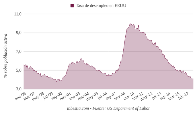 EEUU: Tasa de paro 4,1% en enero Según los datos del Departamento de Trabajo de Estados Unidos, la tasa de paro se mantuvo invariable en el 4,1% en enero. El desempleo venía cayendo desde 2009 y la... 2 de febrero, 2018