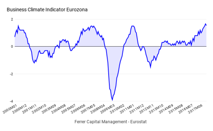 El índice de confianza empresarial cae a 1,54, pero sigue en altos niveles El índice de confianza empresarial del conjunto de la Eurozona, obtenido tras una encuesta a 40.000 firmas europeas, registró en enero el segundo mayor punto desde el... 30 de enero, 2018