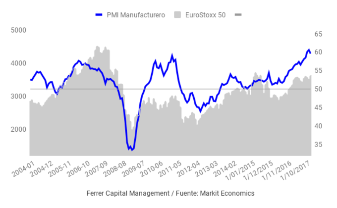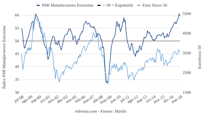 Eurozona: PMI Manufacturero 59,6 en enero El indicador de difusión sobre la actividad del sector industrial de la zona euro, declinó este mes de enero hasta los 59,6 puntos desde los 60,6 del mes anterior, en lo... 1 de febrero, 2018