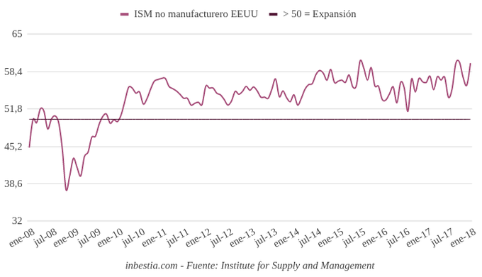EEUU: Índice ISM no manufacturero 59 en enero El índice elaborado por Institute for Supply Management (ISM) para el sector no manufacturero alcanzó en enero el nivel de 59,9, un dato significativamente superior al del... 5 de febrero, 2018