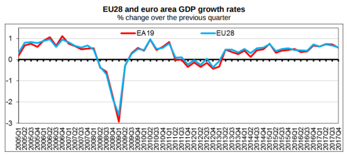 Eurozona: PIB +0,6% en el 4º trimestre de 2017 Según Eurostat, el crecimiento económico de la zona euro en el cuarto trimestre de 2017 fue del 0,6%, alcanzando el 2,5% en el conjunto del año. Se trata de un ritmo de... 30 de enero, 2018