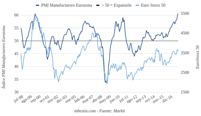 Eurozona: PMI Manufacturero 60,6 en diciembre El indicador de actividad industrial elaborado por Markit Economics para la zona euro ha confirmado el dato adelantado de diciembre en el nivel de 60,6, cinco décimas... 2 de enero, 2018