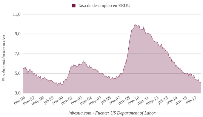 EEUU: Tasa de paro 4,1% en diciembre Según los datos del Departamento de Trabajo de Estados Unidos, la tasa de paro se mantuvo invariable en el 4,1% en diciembre. El desempleo venía cayendo desde 2009 y... 5 de enero, 2018