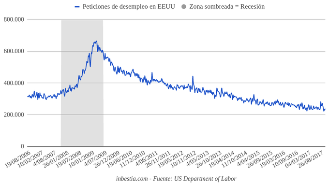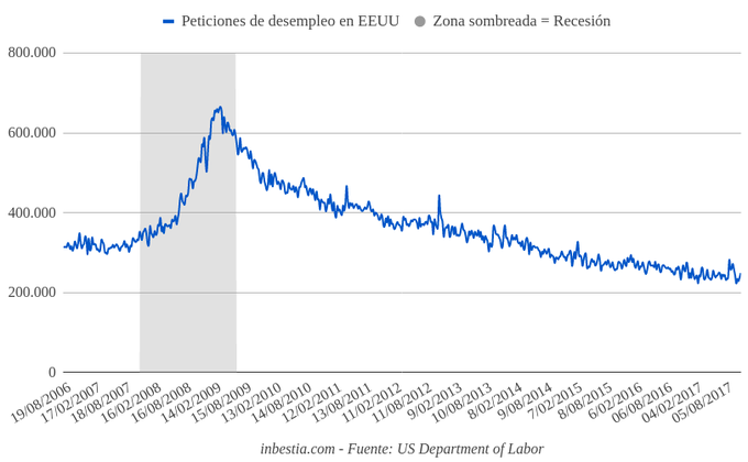 EEUU: Peticiones de paro 249.000 Durante la pasada semana se solicitaron 249.000 nuevos seguros de desempleo en los Estados Unidos, una cifra superior al dato revisado de la semana anterior de 239.000. Tras... 16 de noviembre, 2017