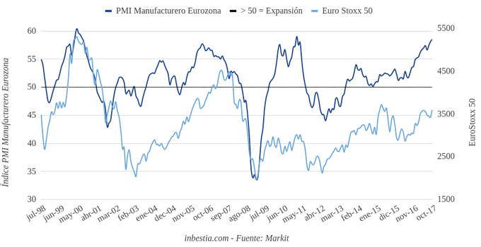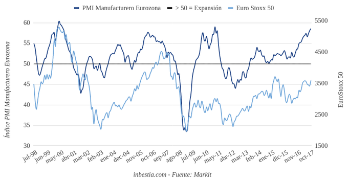 Eurozona: PMI Manufacturero 58,5 en octubre El indicador de actividad industrial elaborado por Markit Economics para la zona euro ha revisado a la baja una décima el dato adelantado de octubre hasta el nivel de 58,5,... 2 de noviembre, 2017