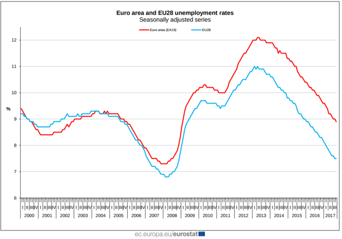 Eurozona: la tasa de paro cae hasta el 8,9% La tasa de paro en el conjunto de la Eurozona cae una décima hasta el 8,9% en el mes de septiembre, según informa hoy Eurostat, la agencia estadística de la Unión... 31 de octubre, 2017
