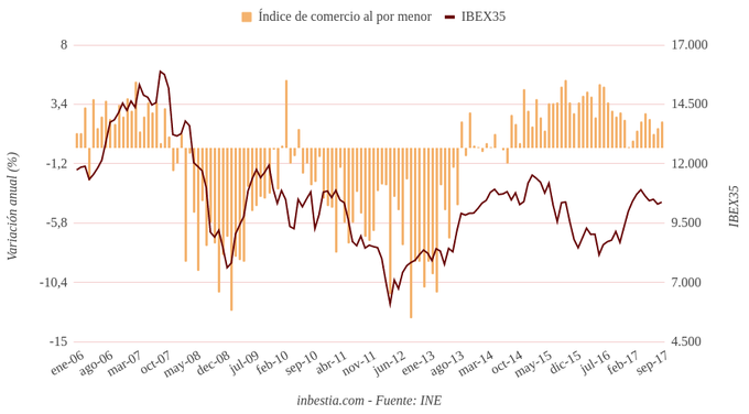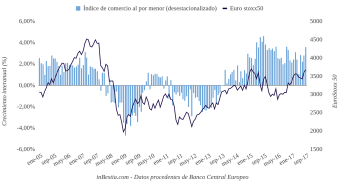 Eurozona: Índice de comercio al por menor +3,7% interanual en septiembre Según los datos procedentes de Eurostat, el volumen del comercio al por menor creció un 3,7% interanual en septiembre en la zona euro. Este dato muestra un ritmo de... 7 de noviembre, 2017