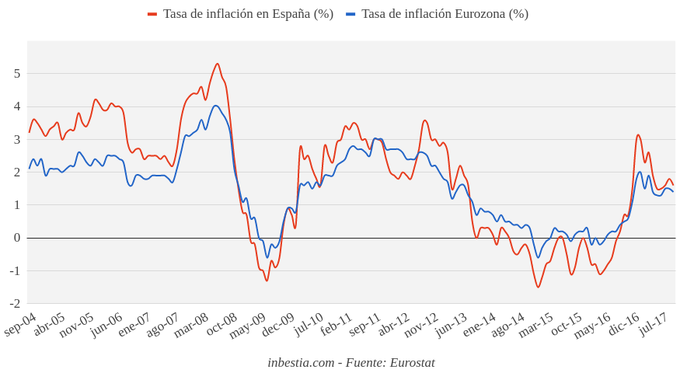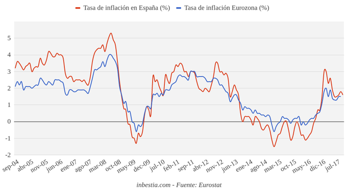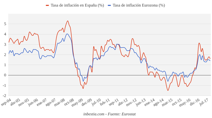 España: Tasa de inflación 1,6% en octubre El Instituto Nacional de Estadística ha confirmado el último dato adelantado de inflación, que se sitúa definitivamente en el 1,6% interanual en octubre. Se trata de un... 14 de noviembre, 2017
