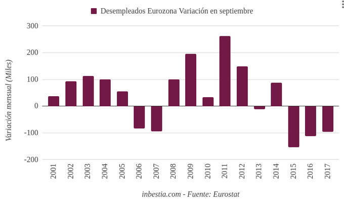 Eurozona: El paro se redujo en 96.000 personas en septiembre El número de parados en el conjunto de la Eurozona se redujo en 96.000 personas hasta un total de 14.513.000. Este dato supone una bajada 1.556.000 con respecto al mismo... 31 de octubre, 2017