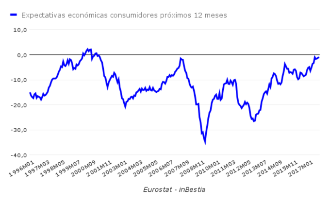 Eurozona: confianza consumidor -1 (optimismo) El índice de confianza del consumidor de la eurozona se mantuvo apenas sin cambios en octubre (-1) con respecto al mes de septiembre (-1,2). Esta estadística, elaborada... 23 de octubre, 2017