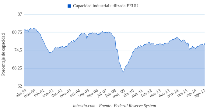 EEUU: Capacidad industrial utilizada 77% en octubre Según la Reserva Federal, el porcentaje de capacidad industrial utilizada en octubre fue del 77%, seis décimas por encima del dato del mes anterior y muy por... 17 de noviembre, 2017