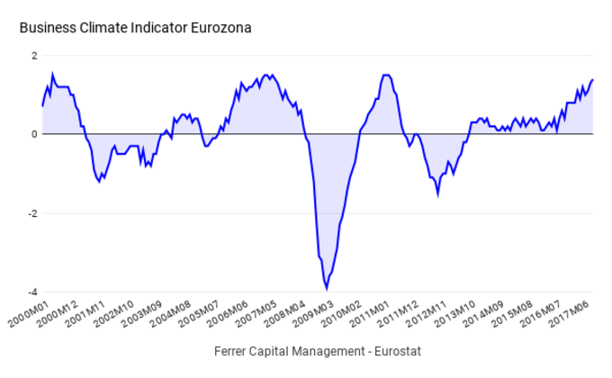 Eurozona: índice clima empresarial 1,4 en octubre El índice de clima empresarial en el conjunto de la Eurozona (EA19) repuntó este mes de octubre hasta los 1,4 puntos, una décima superior a septiembre, marcando el... 30 de octubre, 2017