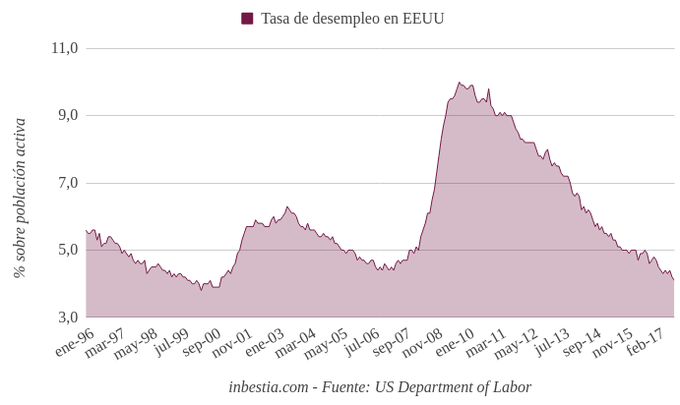 EEUU: Tasa de paro 4,1% en octubre Según los datos del Departamento de Trabajo de Estados Unidos, la tasa de paro descendió una décima hasta el 4,1% en octubre. El desempleo venía cayendo desde 2009 y la... 3 de noviembre, 2017
