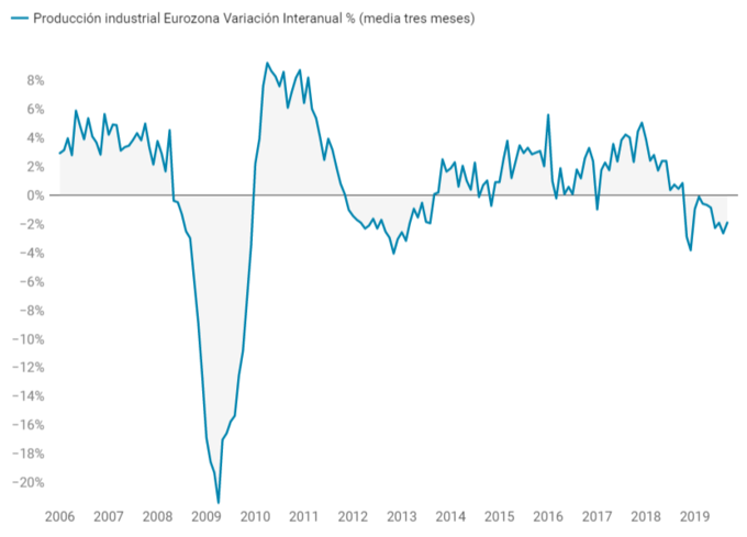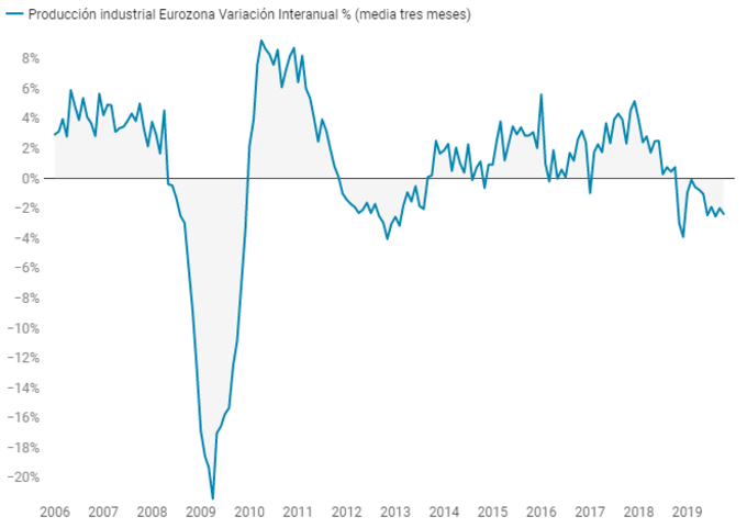 Eurozona: producción industrial -0,5% en octubre La producción industrial de la eurozona declinó cinco décimas porcentuales en el mes de octubre con respecto al mes de septiembre, según informa Eurostat, la agencia... 12 de diciembre, 2019