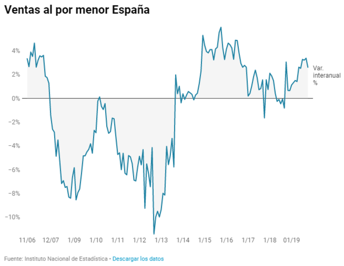 España: ventas minoristas sin variaciones en octubre Las ventas al por menor se mantuvieron en octubre al mismo nivel que en el mes anterior de septiembre. En términos interanuales, el crecimiento es de un sólido 2,62% en... 28 de noviembre, 2019