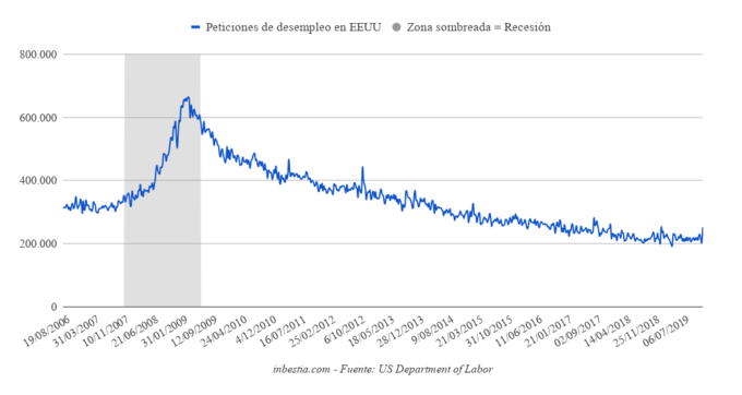 EEUU: Peticiones de paro 252.000 Durante la pasada semana se solicitaron 252.000 nuevos seguros de desempleo en los Estados Unidos, una cifra significativamente más elevada a la de semanas... 12 de diciembre, 2019