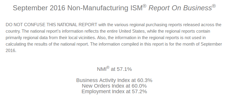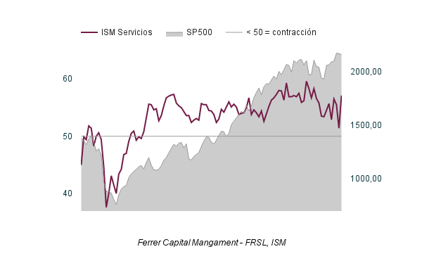 Según el instituto ISM y su indice ISM Servicios que intenta reflejar la evolución del principal sector de la economía estadounidense, el sector servicios siguió creciendo al reflejar dicho indicador un nivel de 57,1, notablemente superior a lo esperado por el consenso y muy por encima de la baja lectura registrada en el mes anterior. Los componentes del indicador crecen también con fuerza, tanto los nuevos pedidos como el índice de actividad.