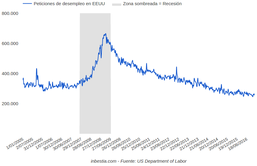 Durante la pasada semana se solicitaron 254.000 nuevos seguros de desempleo en los Estados Unidos, una cifra ligeramente inferior a la de la semana anterior. En los últimos 12 meses la serie se ha mantenido estable por debajo de las 300.000 peticiones de desempleo, lo que indica que la economía se encuentra lejos de una posible recesión:Puede seguir este canal de noticias y datos económicos a través de nuestro twitter @inBestia24H.