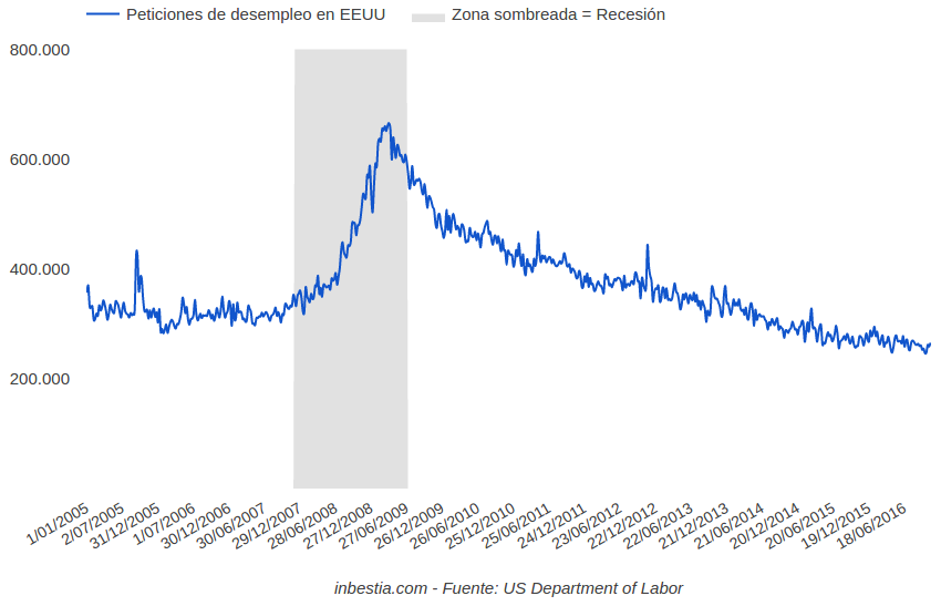 EEUU: Peticiones de paro 265.000 3 de noviembre, 2016 0Durante la pasada semana se solicitaron 265.000 nuevos seguros de desempleo en los Estados Unidos, una cifra ligeramente superior a la de la semana anterior. El dato se encuentra en un máximo de tres meses, aunque de momento no representa una tendencia significativa. En los últimos 12 meses la serie se ha mantenido estable por debajo de las 300.000 peticiones de desempleo:Puede seguir este canal de noticias y datos económicos a través de nuestro twitter @inBestia24H.me gusta (1)Usuarios a los que les gusta esta noticia:Escriba un nuevo comentarioIdentifíquese ó regístrese para comentar la noticia.Esta noticia no tiene comentarios