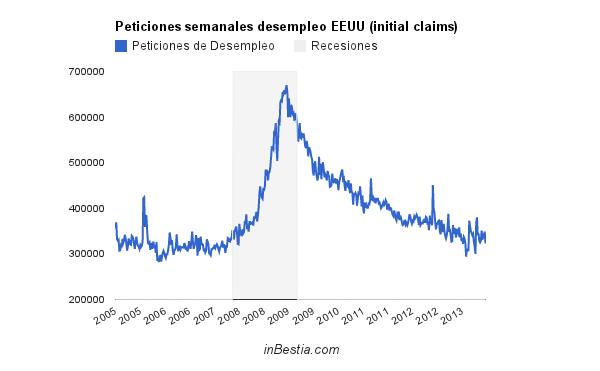 La pasada semana las peticiones de los seguros de desempleo en EEUU descendieron notablemente desde las 349.000 hasta las 323.000. Esta cifra representa un -3,29% que hace un año.