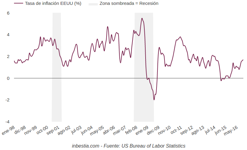 La tasa de inflación anual en Estados Unidos se sitúa en el 1,7% en noviembre, una décima superior al mes anterior, debido principalmente al incremento de los precios de los combustibles. La tasa de inflación anual mide la variación porcentual del índice de precios al consumo, el cual se calcula a través de una cesta de consumo representativa del consumidor estadounidense. A continuación, se muestra la serie histórica: