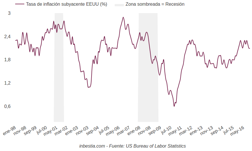 Otro indicador obtenido del índice de precios es la tasa de inflación subyacente, que excluye las secciones de alimentos y energía, siendo un dato más estable que refleja mejor la verdadera tendencia del nivel de precios. La tasa de inflación subyacente fue del 2,1% en noviembre, al mismo nivel que el dato del mes anterior y cerca del registro más alto desde julio de 2012: