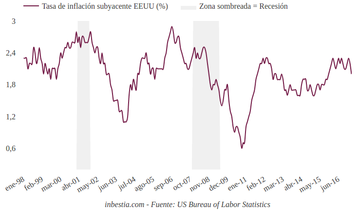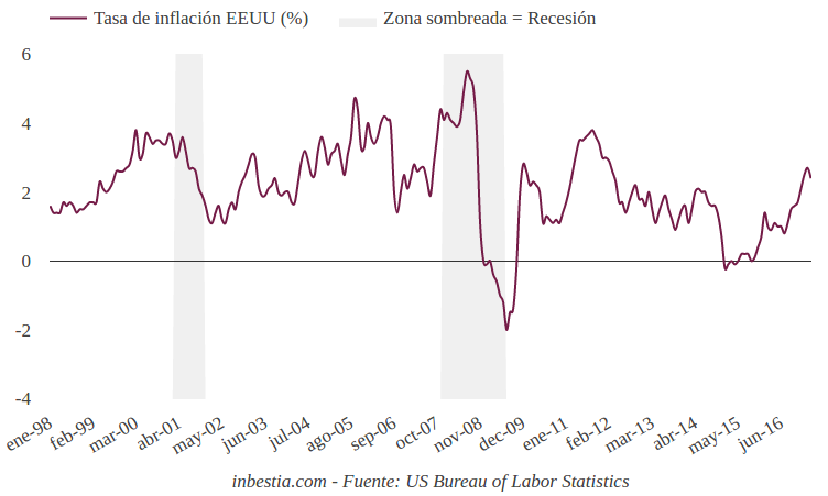 EEUU: Tasa de inflación anual 2,4% en marzo 19 de abril, 2017 0La tasa de inflación anual en Estados Unidos se sitúa en el 2,4% en marzo, tres décimas inferior al mes anterior. El componente que más empuja al alza son los combustibles, cuya subida se ha moderado recientemente. La tasa de inflación anual mide la variación porcentual del índice de precios al consumo, el cual se calcula a través de una cesta de consumo representativa del consumidor estadounidense. A continuación, se muestra la serie histórica:Otro indicador obtenido del índice de precios es la tasa de inflación subyacente, que excluye las secciones de alimentos y energía, siendo un dato más estable que refleja mejor la verdadera tendencia del nivel de precios. La tasa de inflación subyacente fue del 2% en marzo, dos décimas inferior al dato del mes anterior:Puede seguir este canal de noticias y datos económicos a través de nuestro twitter @inBestia24H.me gusta (1)Usuarios a los que les gusta esta noticia:Escriba un nuevo comentarioIdentifíquese ó regístrese para comentar la noticia.Esta noticia no tiene comentarios