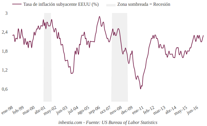 Otro indicador obtenido del índice de precios es la tasa de inflación subyacente, que excluye las secciones de alimentos y energía, siendo un dato más estable que refleja mejor la verdadera tendencia del nivel de precios. La tasa de inflación subyacente fue del 2,3% en diciembre, una décima superior al dato del mes anterior e igualando el registro más alto desde julio de 2012: