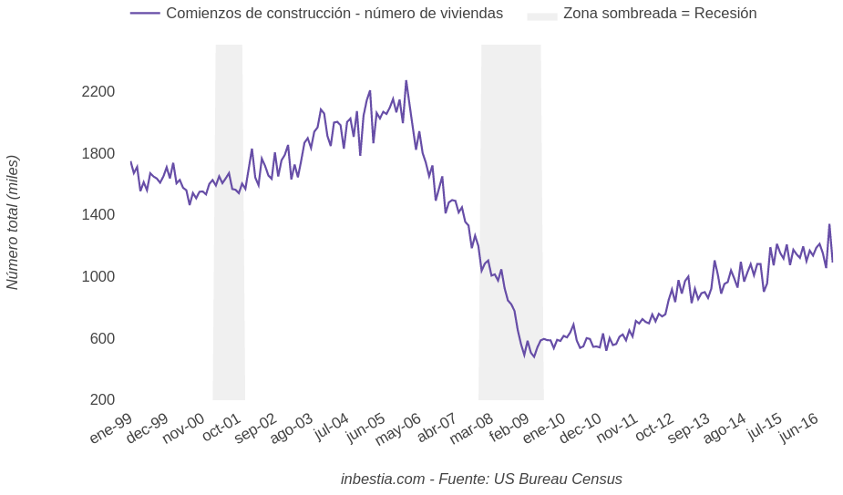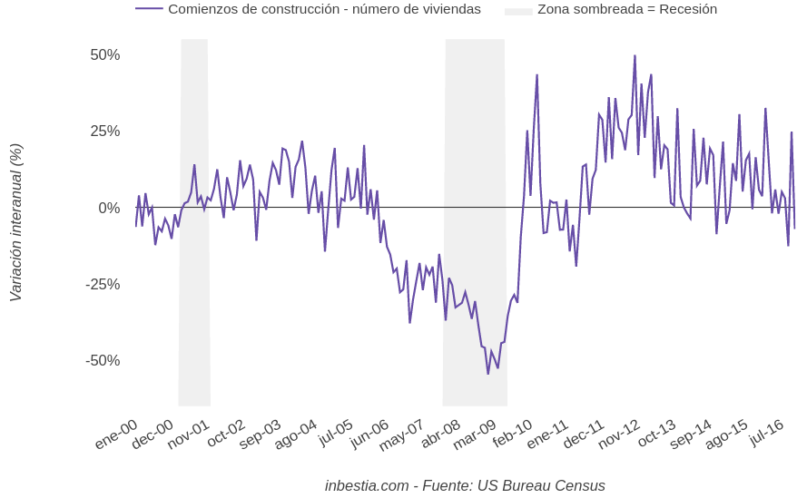 EEUU: Viviendas en comienzo de construcción 1.090.000 en noviembre 16 de diciembre, 2016 0El número de viviendas que se comenzaron a construir en Estados Unidos se ha estimado en 1.090.000 para los últimos 12 meses, dato corregido a efectos estacionales en noviembre. Esta cifra es significativamente inferior al dato revisado al alza del mes anterior de 1.340.000. La tendencia de varios años sigue siendo ligeramente positiva. A continuación la serie histórica:Comparando con el mismo mes del año anterior, el número de viviendas comenzadas bajó un 7% interanual, situándose en terreno negativo, aunque lejos de niveles que indican una recesión inminente. Como se puede observar, se trata de un indicador adelantado al ciclo económico:Puede seguir este canal de noticias y datos económicos a través de nuestro twitter @inBestia24Hme gusta (1)Usuarios a los que les gusta esta noticia:Escriba un nuevo comentarioIdentifíquese ó regístrese para comentar la noticia.Esta noticia no tiene comentarios