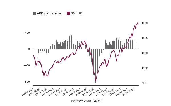 El sector privado de EEUU crea 179.000 empleos en mayo 4 de junio, 2014 0Según informa la entidad privada Automatic Data Processing el sector privado creó 179.000 puestos de trabajo en mayo. Esta cifra es menor que la esperada por el consenso (200.000) y menos que la del mes pasado (215.000). En la imagen se representa la evolución mes a mes de la creación o destrucción de empleo en el sector privado junto con el índice bursátil S&P 500. El viernes se hará oficial el dato de empleo que engloba al sector privado y público y que es ofrecido por la propia administración norteamericana.me gusta Usuarios a los que les gusta esta noticia:Escriba un nuevo comentarioIdentifíquese ó regístrese para comentar la noticia.Esta noticia no tiene comentarios