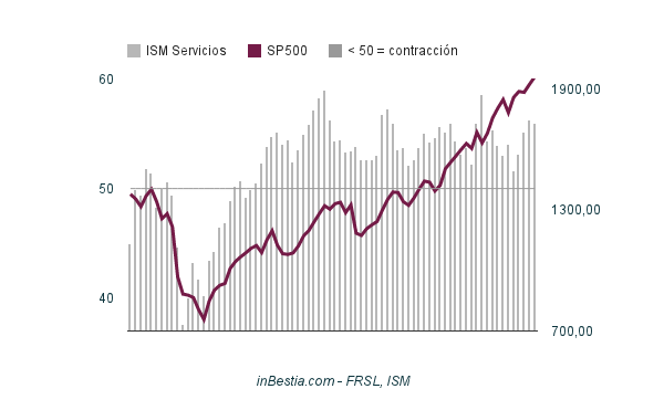 Según datos publicados hoy por el instituto ISM, el sector servicios norteamericano siguió creciendo según el índice de difusión ISM Servicios que registró 56 puntos. A pesar de ello, se trata de una cifra por debajo del mes anterior (56,3) y por debajo de la expectativa del mercado (56,5).En este índice basado en encuestas sobre la situación real de las empresas en dicho sector, una lectura por encima de 50 significa que la actividad económica crece y una lectura sobre 50 pero que es menor que el mes anterior significa que la actividad económica crece pero lo hace a un ritmo menor.