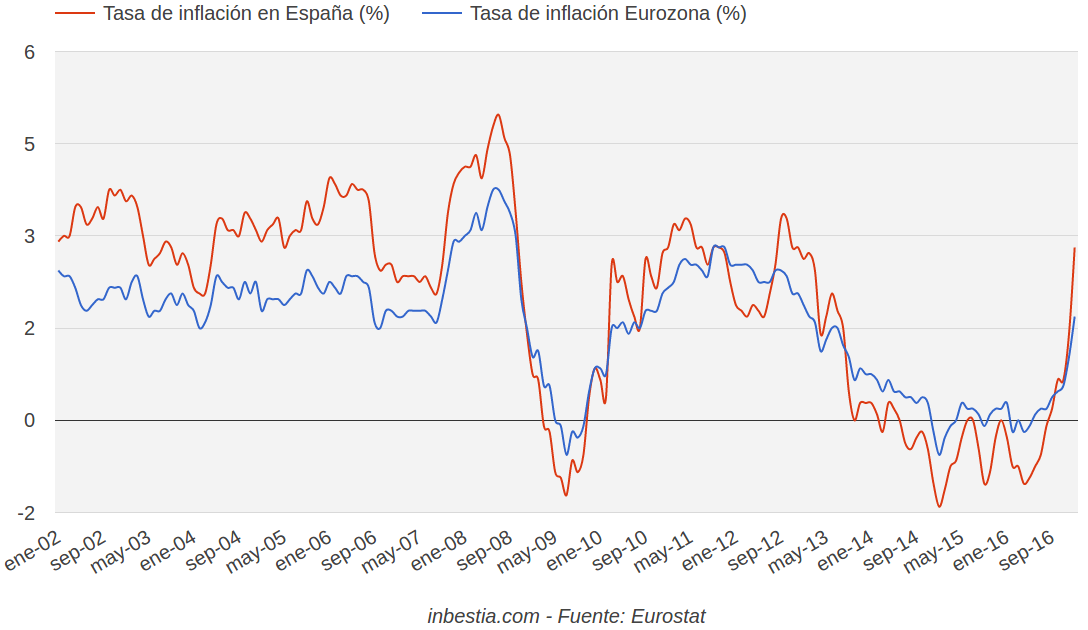 A continuación, se muestra la serie histórica de la tasa de inflación en España y la zona euro, donde se puede observar cómo la tasa de inflación en España vuelve a igualar o superar a la de la zona euro tras más de tres años por debajo: