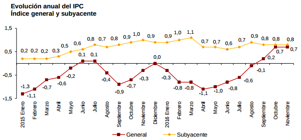 A su vez, la tasa de inflación subyacente, que excluye energía y alimentos, se mantiene en el 0,8% en noviembre, prácticamente igualándose con la tasa de inflación total.