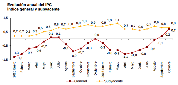 l Instituto Nacional de Estadística ha confirmado el dato adelantado de inflación, que se sitúa definitivamente en el 0,7% interanual en octubre. Este dato está cinco décimas por encima del mes anterior, abandonando el terreno negativo tras casi un año.