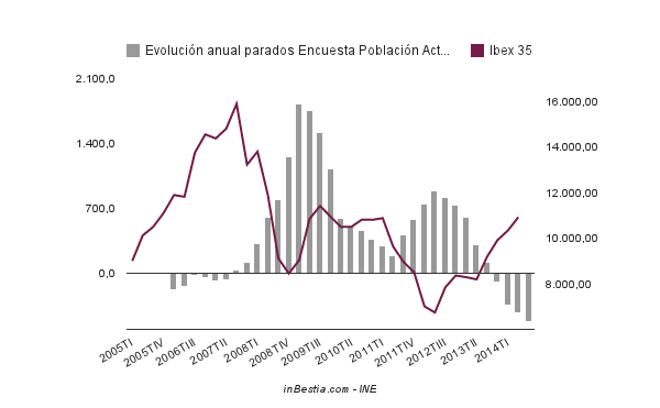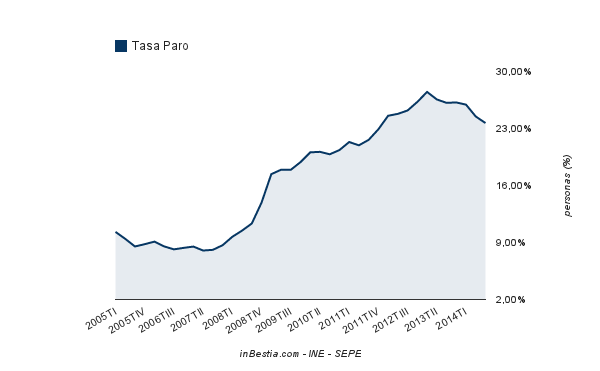 La tasa de paro en España descendió hasta el 23,67% en el tercer trimestre de 2014, la cifra más baja desde el último trimestre de 2011.En términos absolutos hay 5.427.700 parados, unos 515,700 menos (-8,68%) que en el mismo trimestre de 2013.