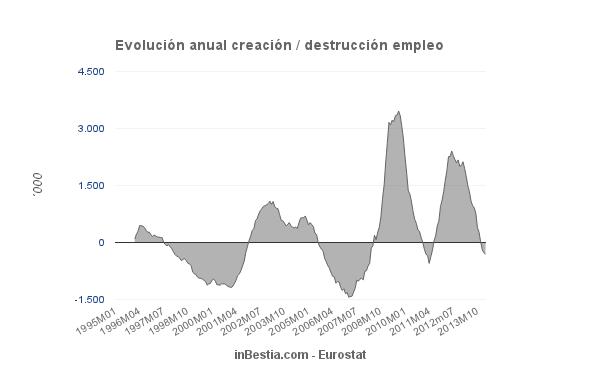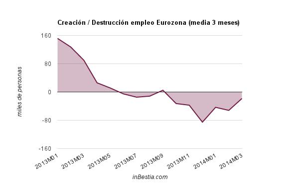 Según Eurostat, en marzo salieron de la situación de desempleo 22.000 personas con respecto a febrero de este año. Los datos de Eurostat tienen un amplio margen de error y son datos que típicamente están sujetos a fuertes revisiones en los meses posteriores. No obstante, la media de 3 meses muestra un descenso de 18.000 personas / mes en el número de personas en situación de desempleo. En marzo de 2014 hubo 314.000 personas menos en el paro que hace un año.