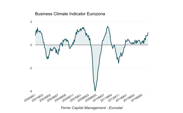 El índice de clima empresarial en el conjunto de la Eurozona (EA19) creció este mes de abril hasta los 1,1 puntos, la mayor lectura del actual ciclo expansivo de la economía de la Eurozona, siendo el nivel más elevado desde mayo de 2011.