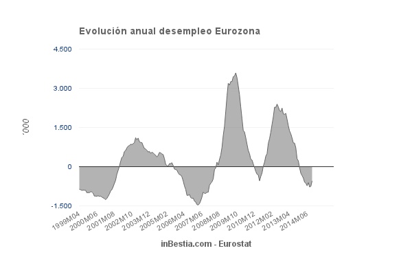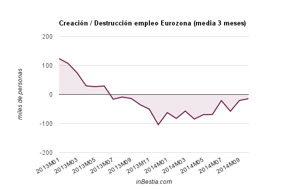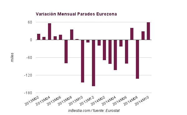 Eurozona: El paro aumenta en 60.000 personas en octubre 28 de noviembre, 2014 0Según ha informado hoy Eurostat, la agencia estadística de la Eurozona, el número de parados en los 18 países de la zona euro aumentó en 60.000 personas. El desempleo ha aumentado en tres de los últimos 4 meses (primer gráfico) y aunque es un dato volátil, la media de 3 meses (segundo gráfico) refleja que la economía europea flirtea con la posibilidad de destruir empleo en términos trimestrales.La evolución interanual muestra que hay 547.000 personas menos en paro que hace un año, pero esta cifra es la peor en 8 meses.me gusta (2)Usuarios a los que les gusta esta noticia:Escriba un nuevo comentarioIdentifíquese ó regístrese para comentar la noticia.Esta noticia no tiene comentarios
