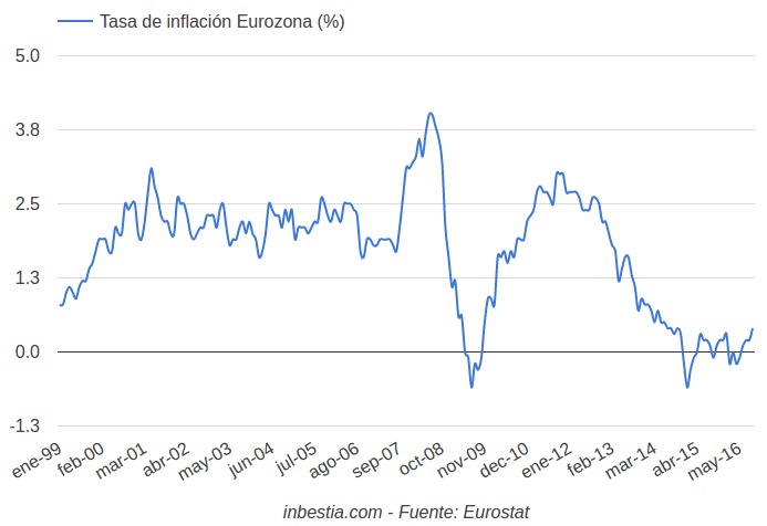 Según Eurostat, el dato de inflación en la zona euro es del 0,4% en septiembre, dos décimas superior al dato del mes anterior. La tasa de inflación confirma la entrada en terreno positivo tras la recientes subidas. Entre sus componentes destaca la caída de precios en el sector energético más de un 3% en los últimos 12 meses, la cual se va suavizando mes a mes.