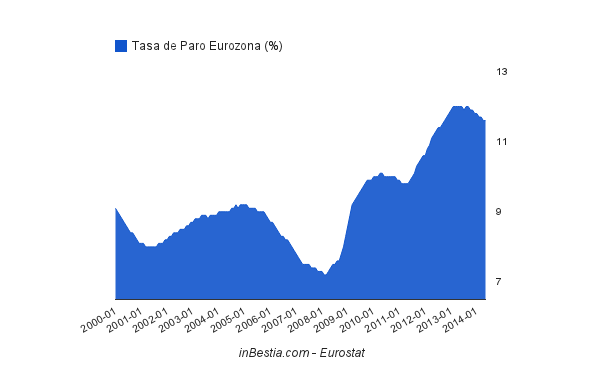 La tasa de paro en la Eurozona se mantiene en el 11,6% 1 de julio, 2014 0Según ha informado hoy Eurostat, la agencia estadística de la Comisión Europea, la tasa de paro en la Eurozona se mantuvo en mayo al mismo nivel que abril, el 11,6%. Esta cifra sigue siendo menor que el máximo cíclico del 12% alcanzado entre febrero y septiembre de 2013.De esta manera, hasta el mes de mayo había en la Eurozona (EA18) 18.441.000 parados, 26.000 menos que en abril.Y en términos interanuales (12 meses) el número de parados en mayo de 2014 era de 629.000 parados menos que en mayo de 2013:me gusta (1)Usuarios a los que les gusta esta noticia:Escriba un nuevo comentarioIdentifíquese ó regístrese para comentar la noticia.Esta noticia no tiene comentarios