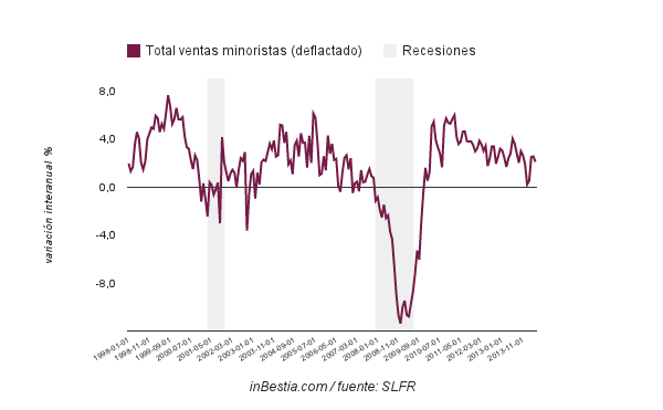 Las ventas al por menor avanzan un 0,2% en junio en los EEUU 15 de julio, 2014 0Las ventas minoristas crecieron en el mes de junio en los Estados Unidos un 0,2%, una cifra por debajo del consenso. El crecimiento mensual del mes de mayo sobre abril ha sido revisado al alza (0,5% vs 0,3% anterior). El avance anual, entre junio de 2013 y junio de 2014 es del 4,3% sin descontar la inflación. me gusta (2)Usuarios a los que les gusta esta noticia:Escriba un nuevo comentarioIdentifíquese ó regístrese para comentar la noticia.Esta noticia no tiene comentarios